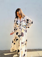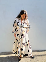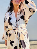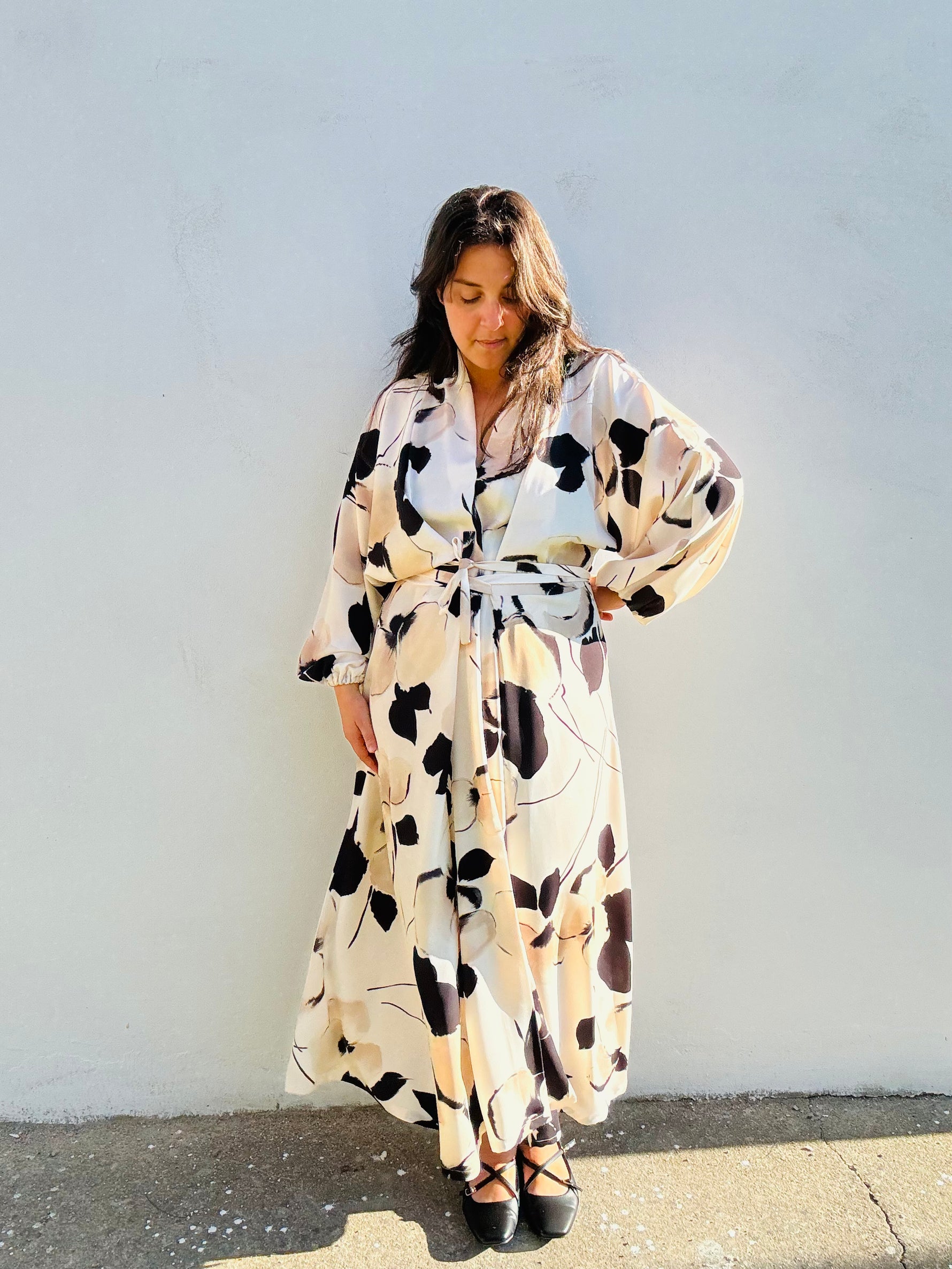 Spacco centrale nella gonna, manica ampia a kimono fermata al polso da un morbido elastico.